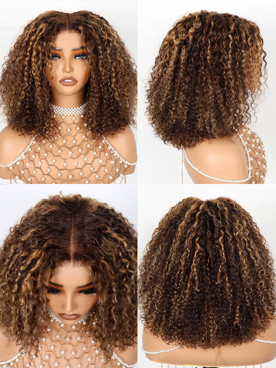 Honey Blonde Highlights Kinky Curly Short Bob Wig Glueless Lace Closure Bob Wigs